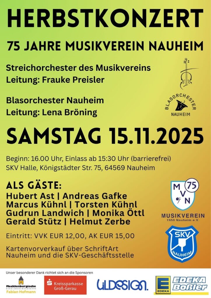 Am 15.11.25 findet das Jubiläumskonzert des Musikvereins ab 16.00 Uhr in der SKV-Halle (Königstädter Str. 75) statt. Frühere Mitglieder von Streich- oder Blasorchester sind herzlich zum Mitspielen eingeladen. Bitte meldet Euch beim Vorstand unter info@musikverein-nauheim.de.