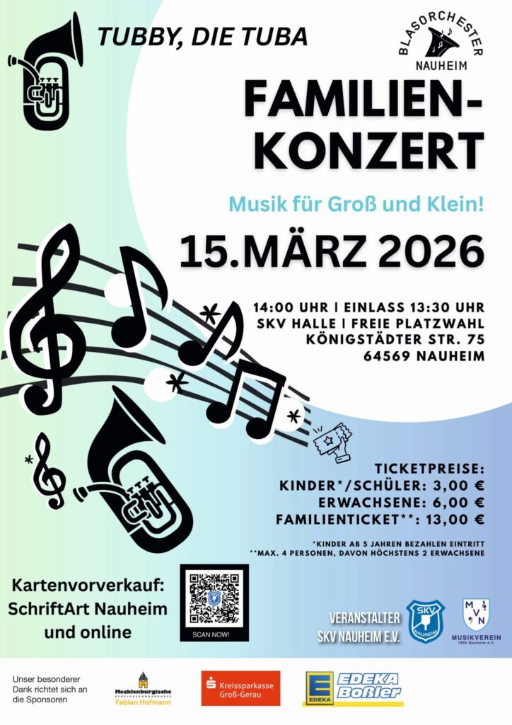 Am 15.03.2026 findet das Familienkonzert des Blasorchester Nauheims ab 14:00 Uhr in der SKV-Halle (Königstädter Str. 75) statt. Die Karten können im Vorverkauf über SchritArt Nauheim oder online über die SKV-Homepage bezogen werden.